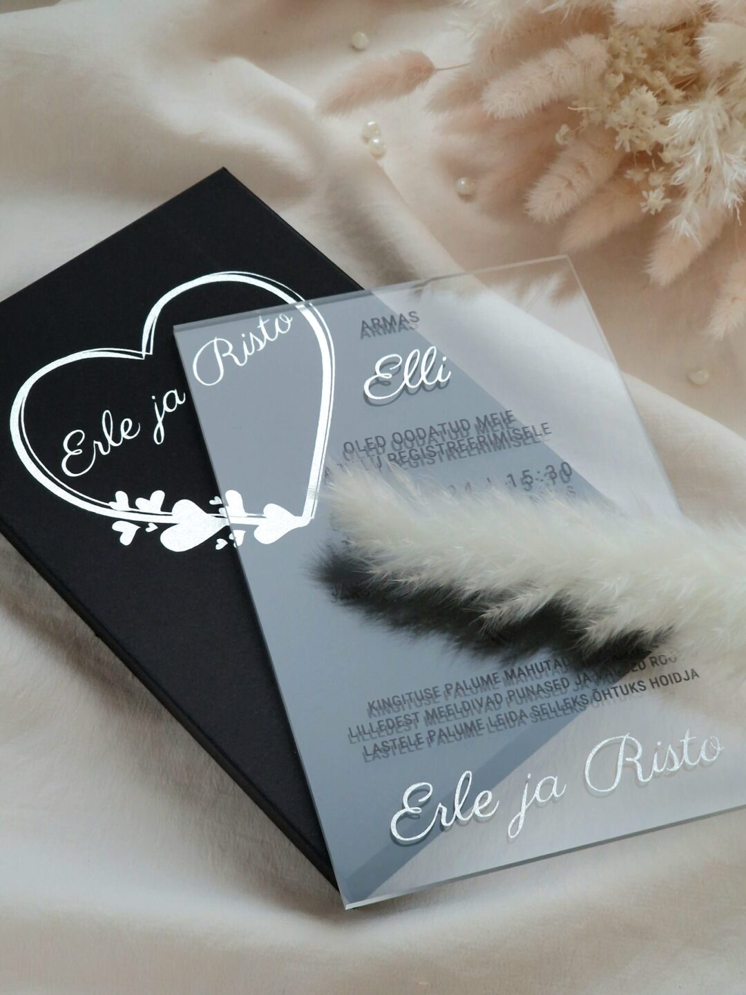 • pleksiklaasil kutsed, läike/sädelusega paberid, tekstuurse paberiga, lumivalge või loodusvalge, maalähedane pruun kartong