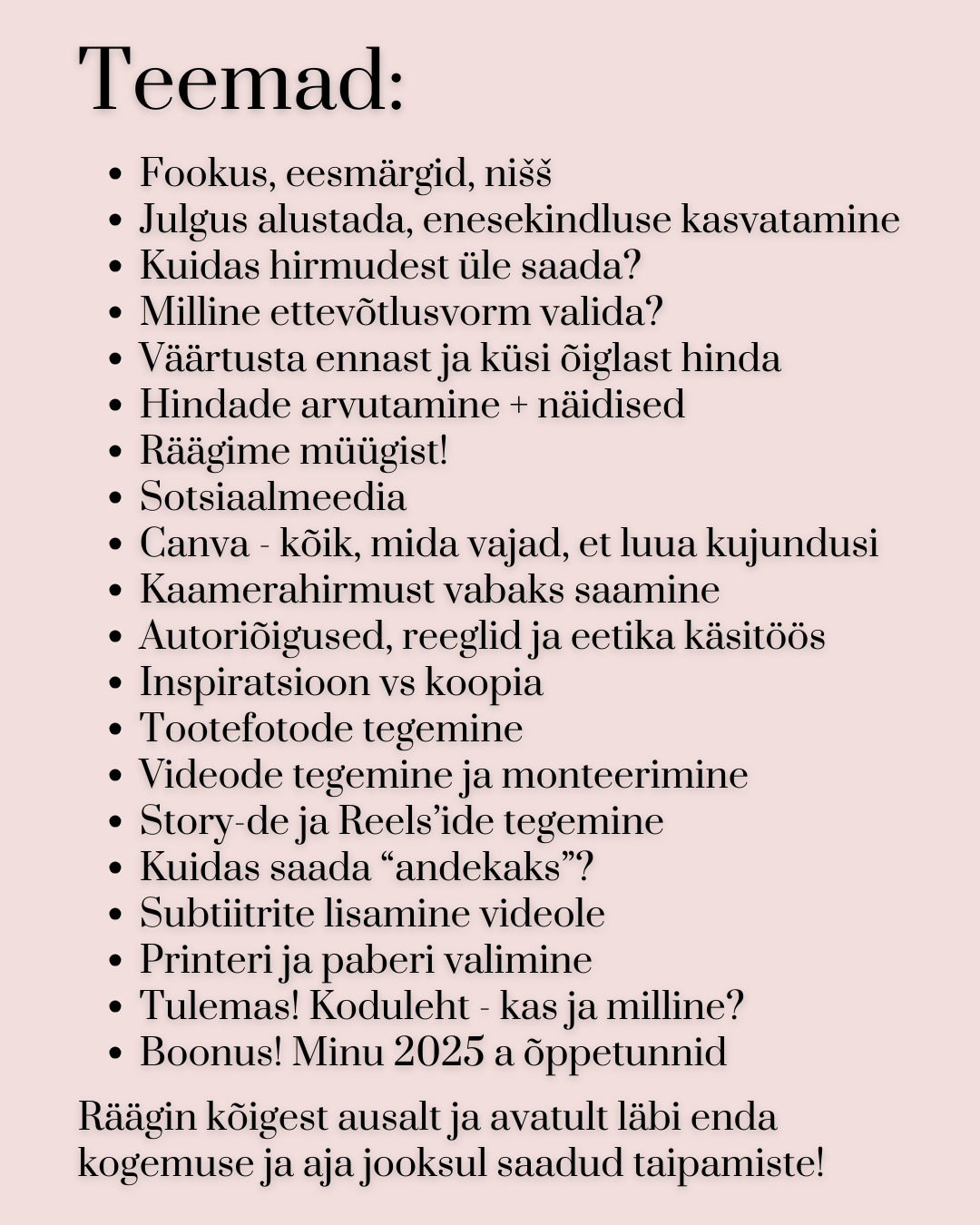 2024 aasta sügisel viisin läbi 24-nädalase mentorgrupi käsitöömeistritele, kus osales 24 tublit naist! Nüüd on mul rõõm jagada seda materjali ka sinuga, aga veelgi mahukamalt. BOONUSENA lisan kausta ka 2025 aasta õppetunnid ja taipamised – see on 1h väärtuslikku õppematerjali. Räägin kõigest avatult ja ausalt, otsekoheselt ja selgelt. Vaata teemasid tootegaleriist!