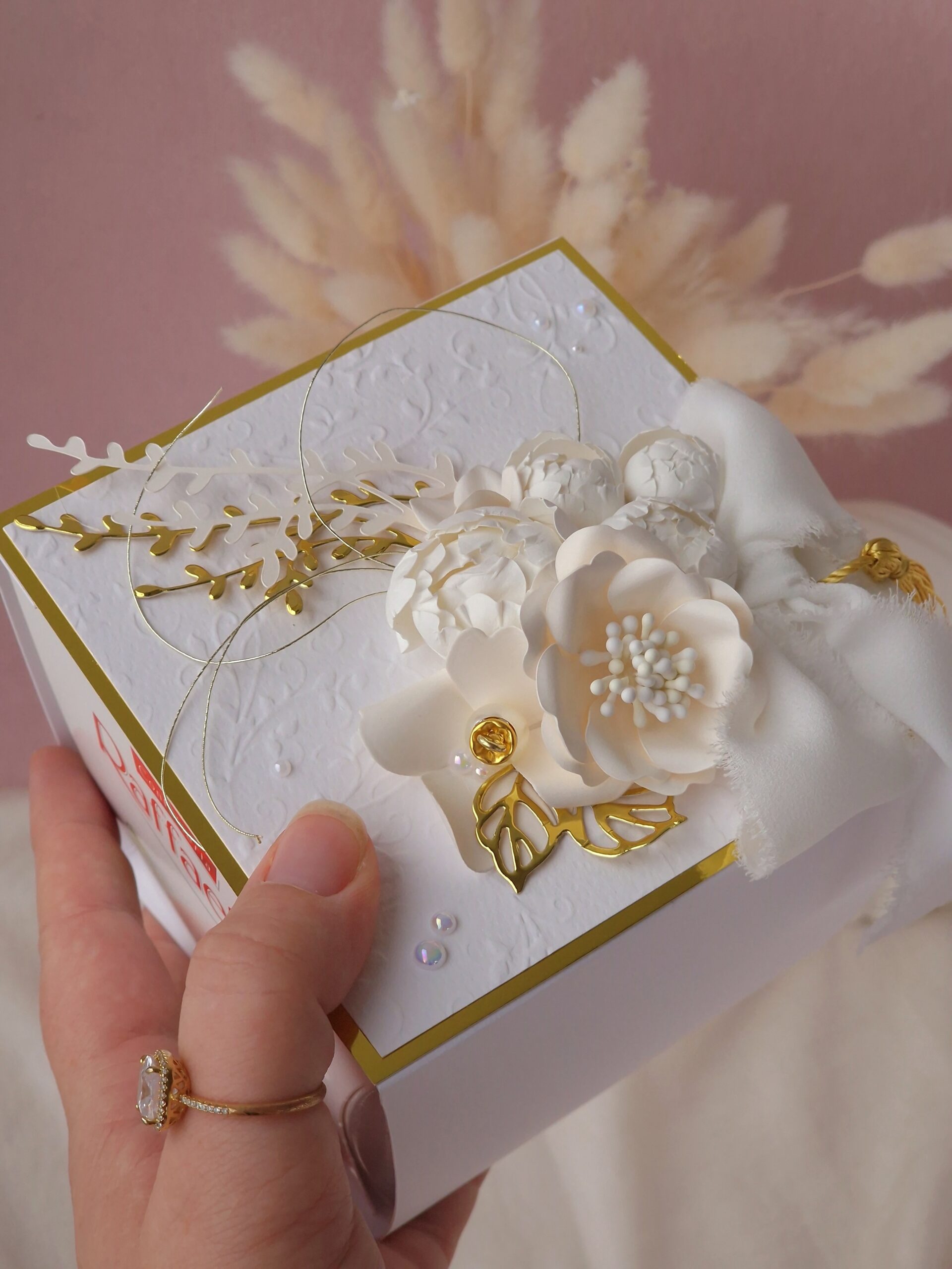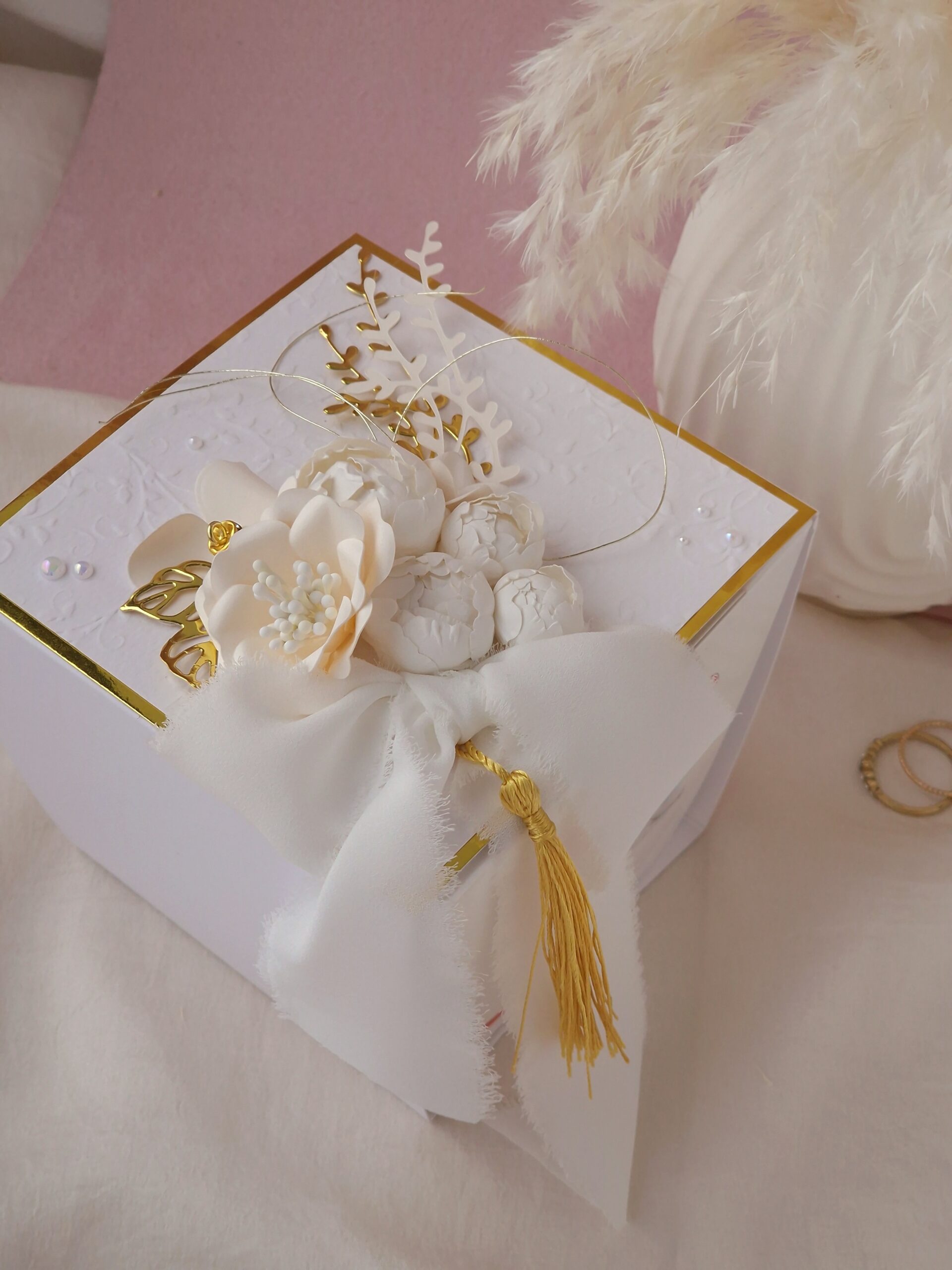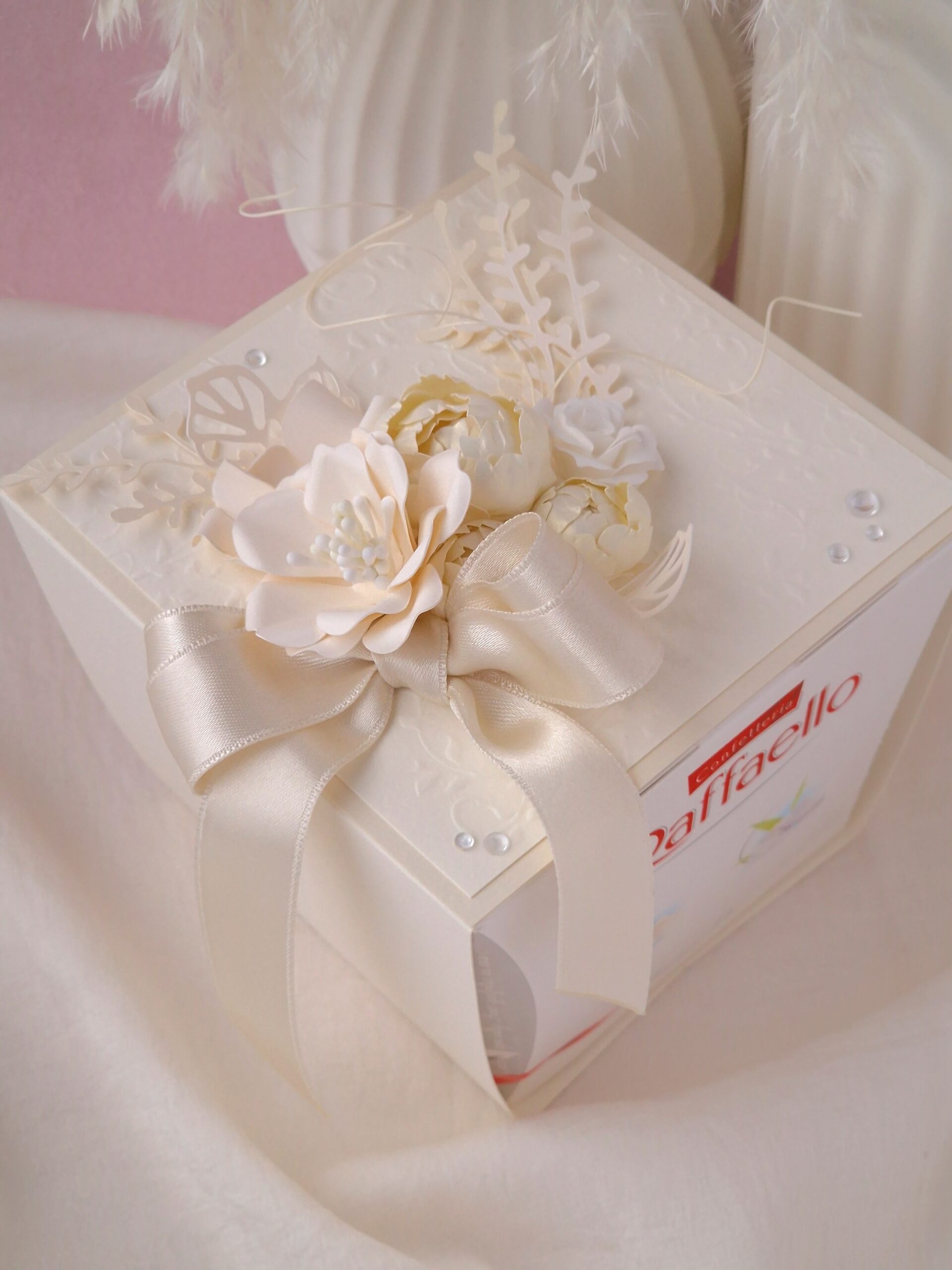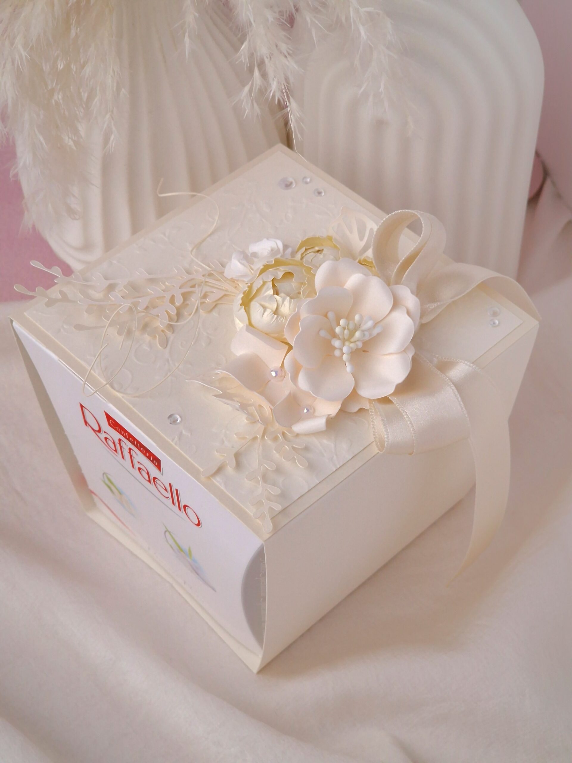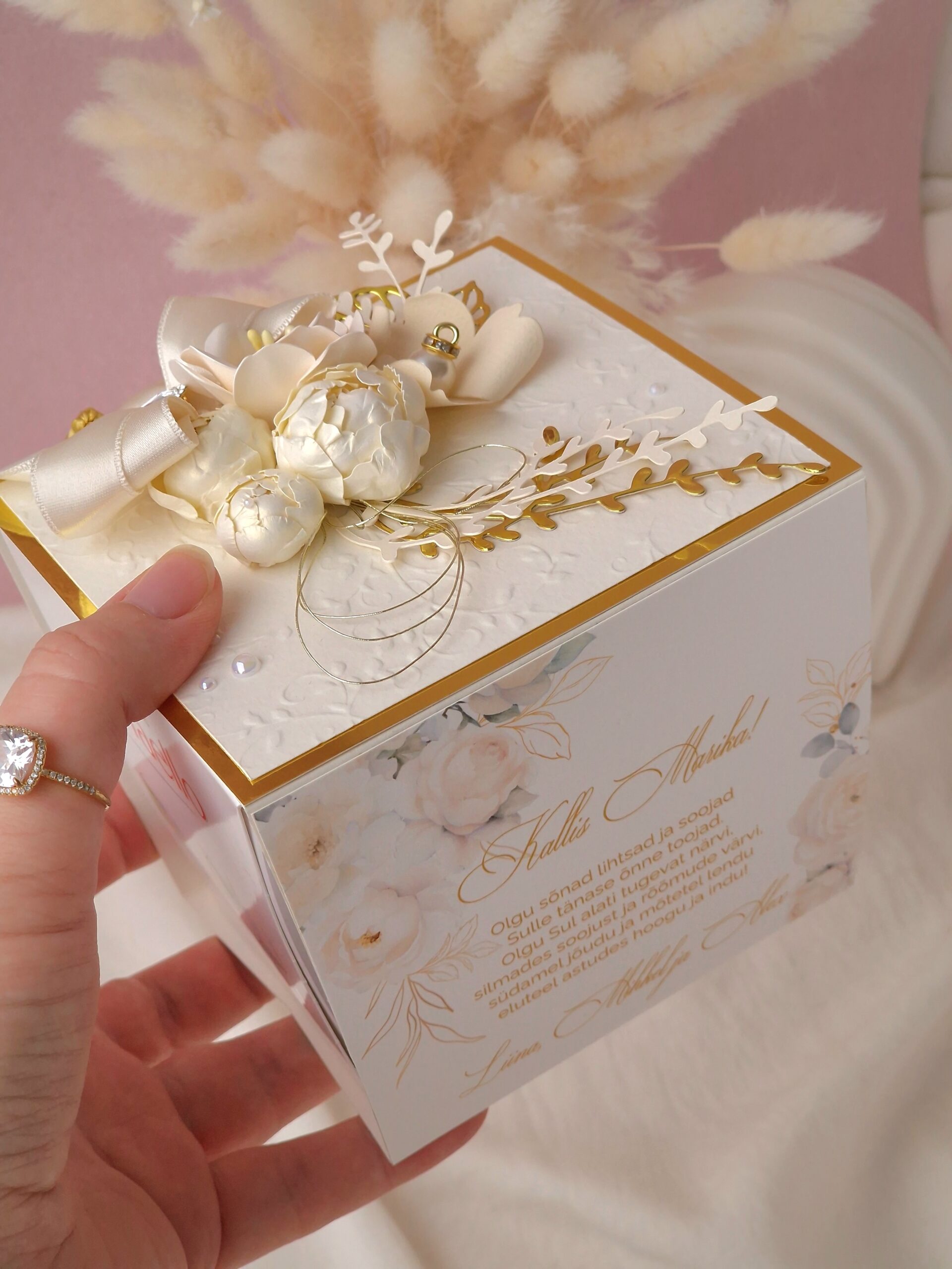 Ümbris valmib käsitööna, kaunistatud paberlilledega. Ümbris on eemaldatatav. Kommikarp (150g) on hinnas!