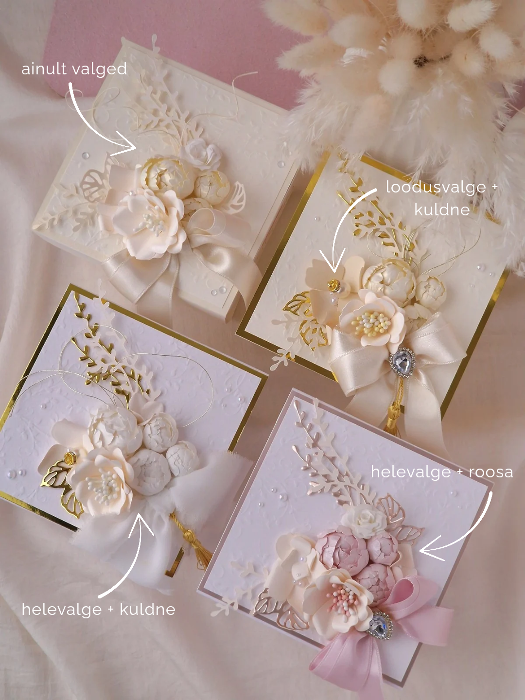 | vali sobiv | helevalge + kuldne, helevalge + roosa, loodusvalge + kuld, ainult valged |